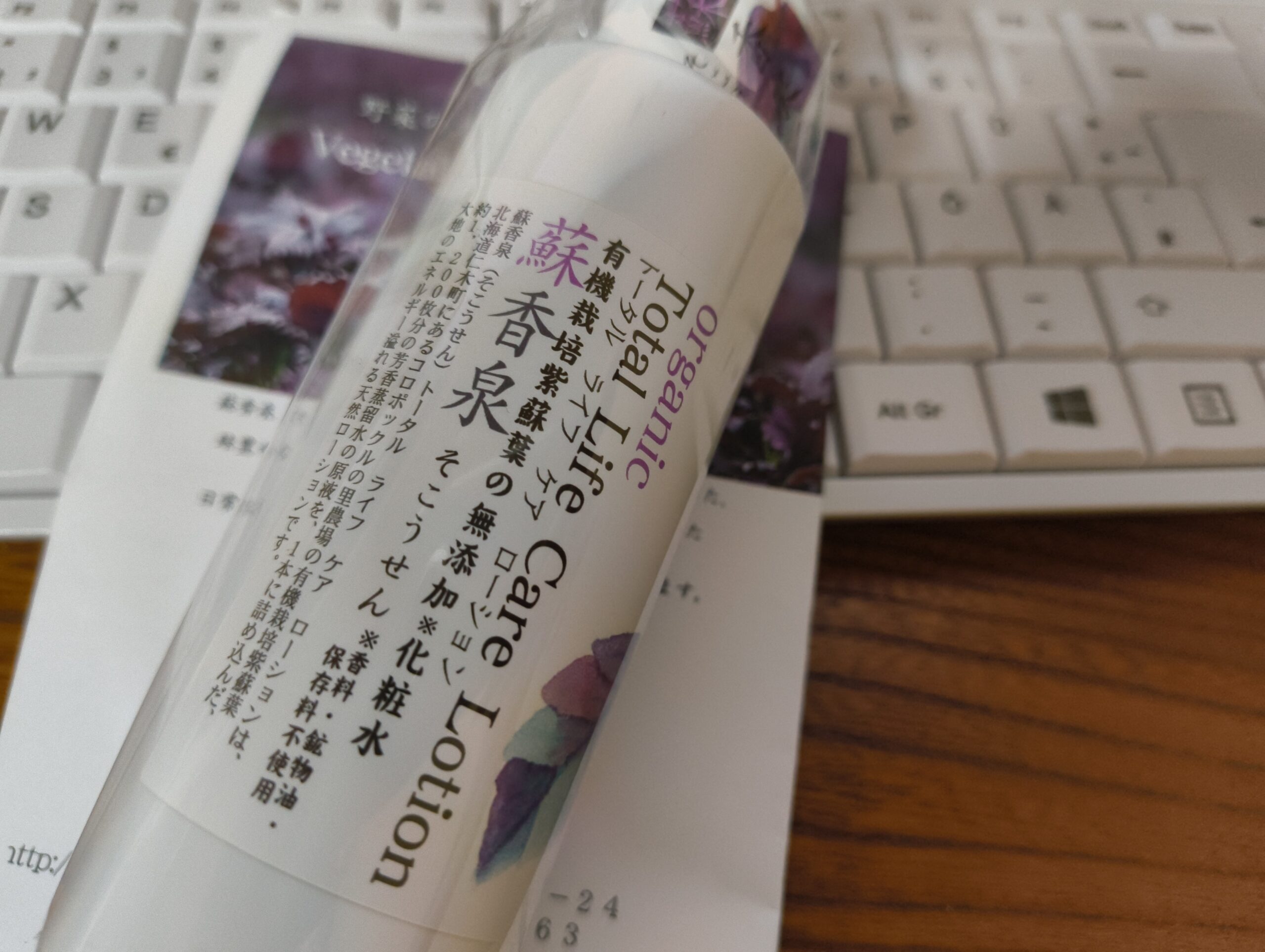 私も興味津々で買い物にいくと、紫蘇のから出来ている化粧水を紹介していただいた。